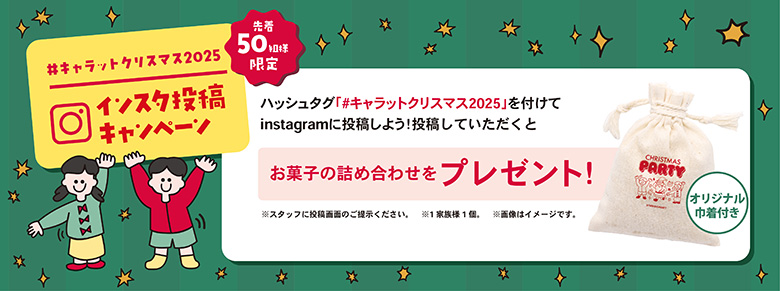 SNSに「#キャラットクリスマス2025」をつけて投稿し、スタッフに画面を見せるだけ!