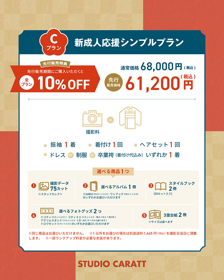 スタジオキャラットの 《2026年 振袖撮影福袋》 は、振袖はもちろん、ドレスや卒業袴/制服まで“まるっと”楽しめる、今だけの撮影キャンペーンです。