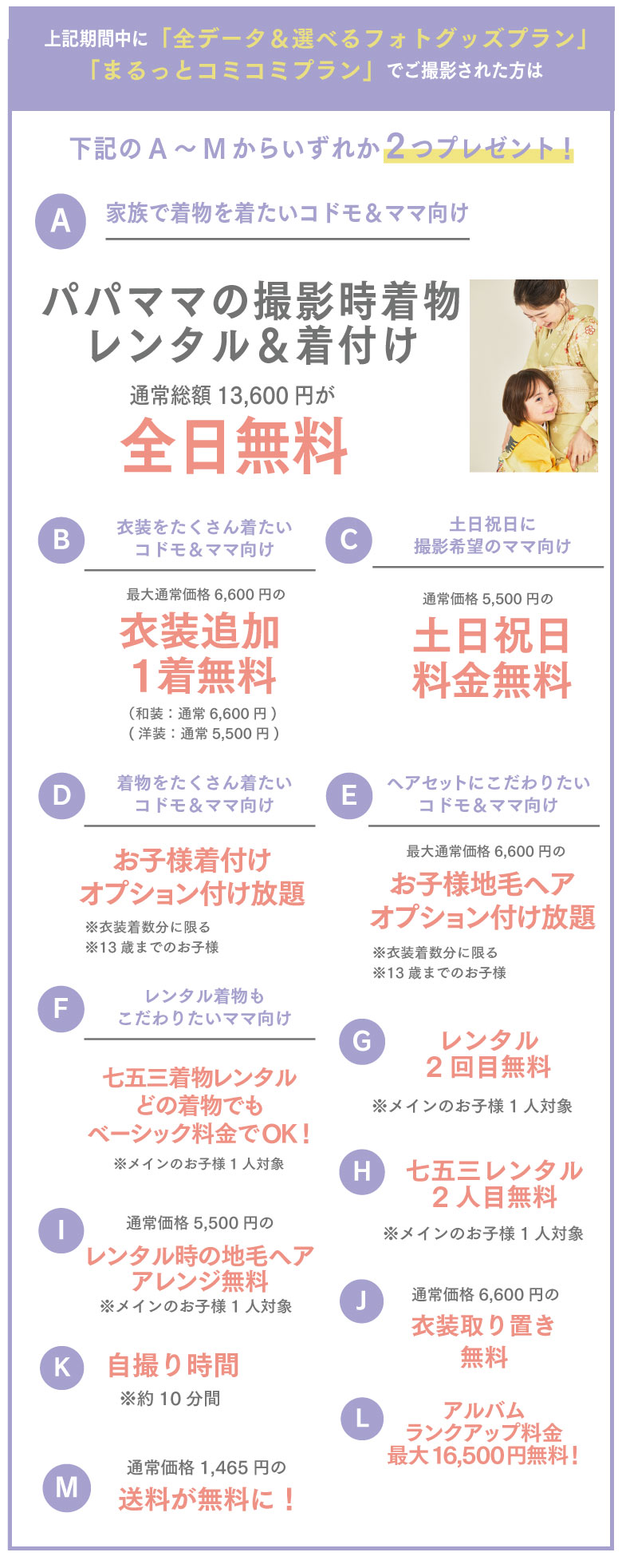 「選べる特典フェア」では、撮影プランに応じて特典を自由に選べるので、ご家族のニーズに合わせた撮影体験が可能です。例えば、夏の暑い日には涼しい室内で、特典を活用してお子さまとママがわくわくするような素敵な写真を撮影することができます。