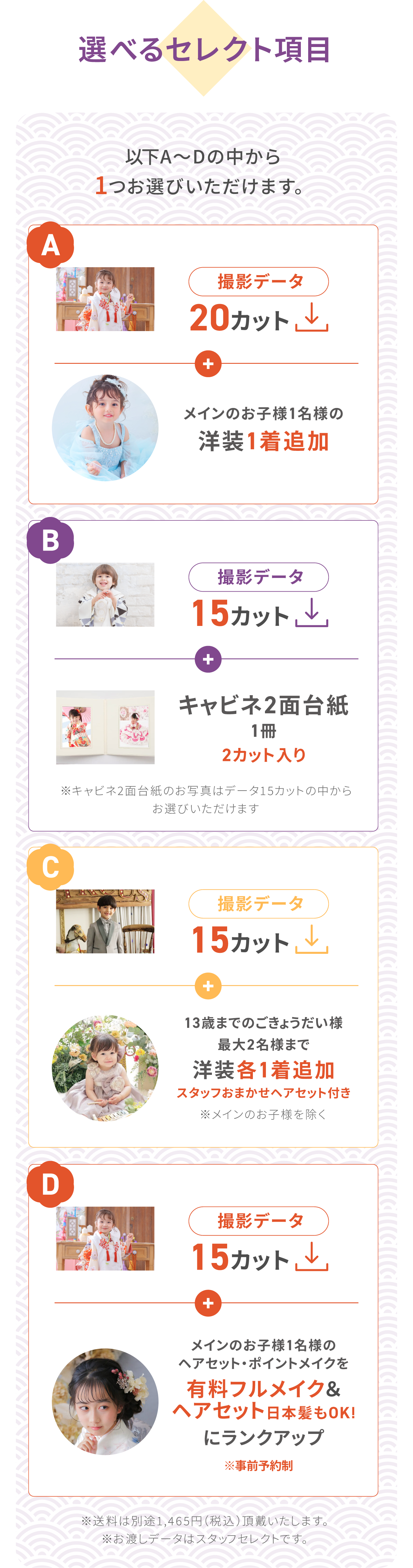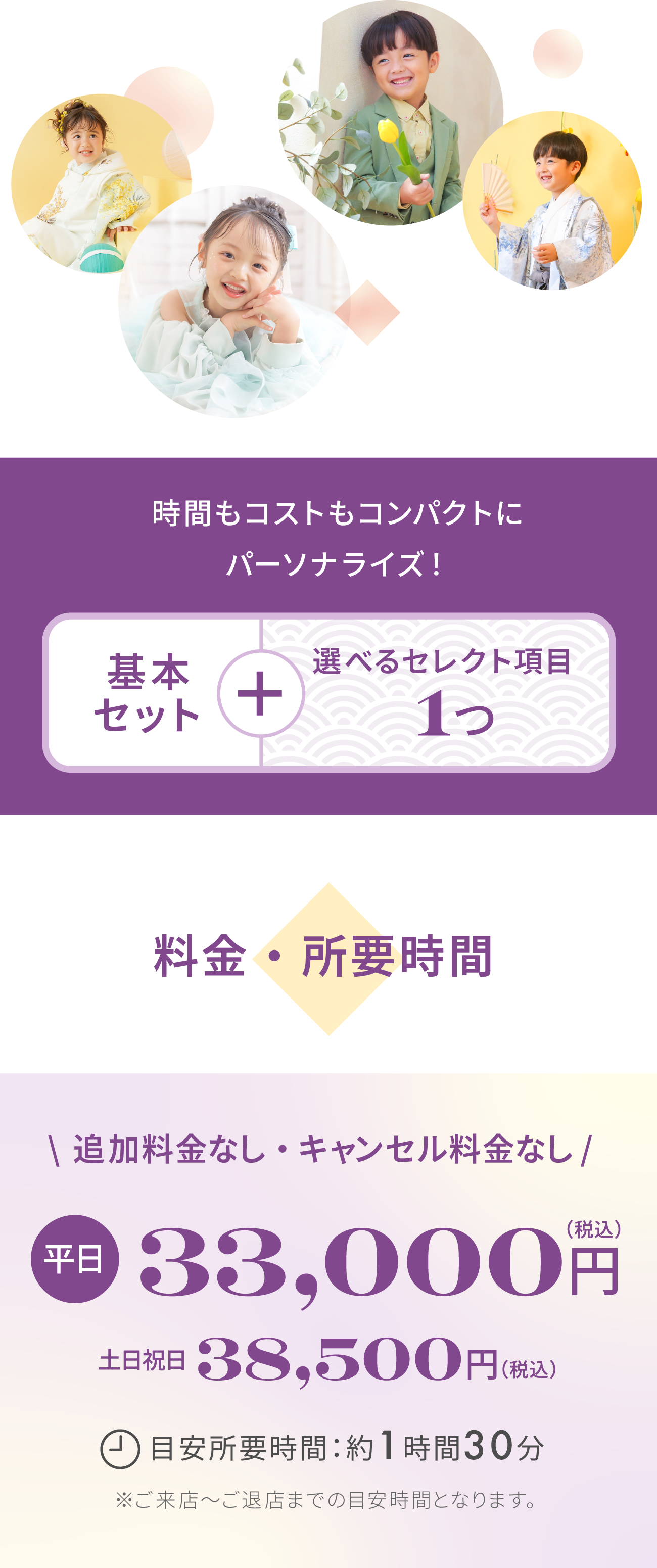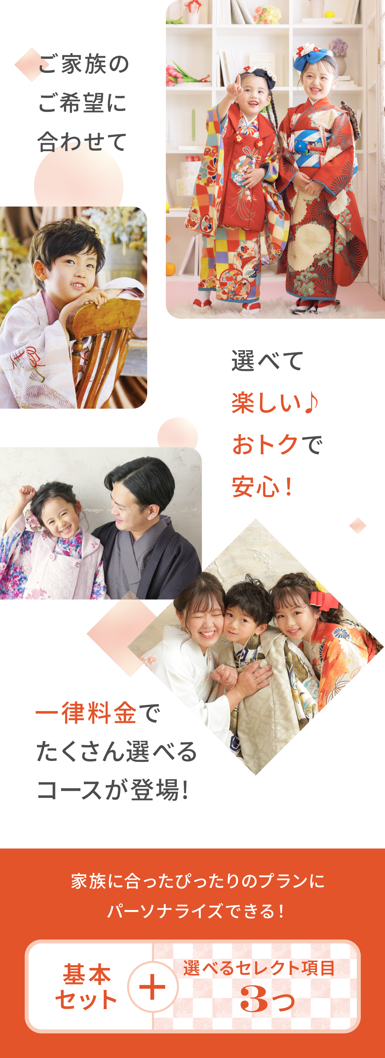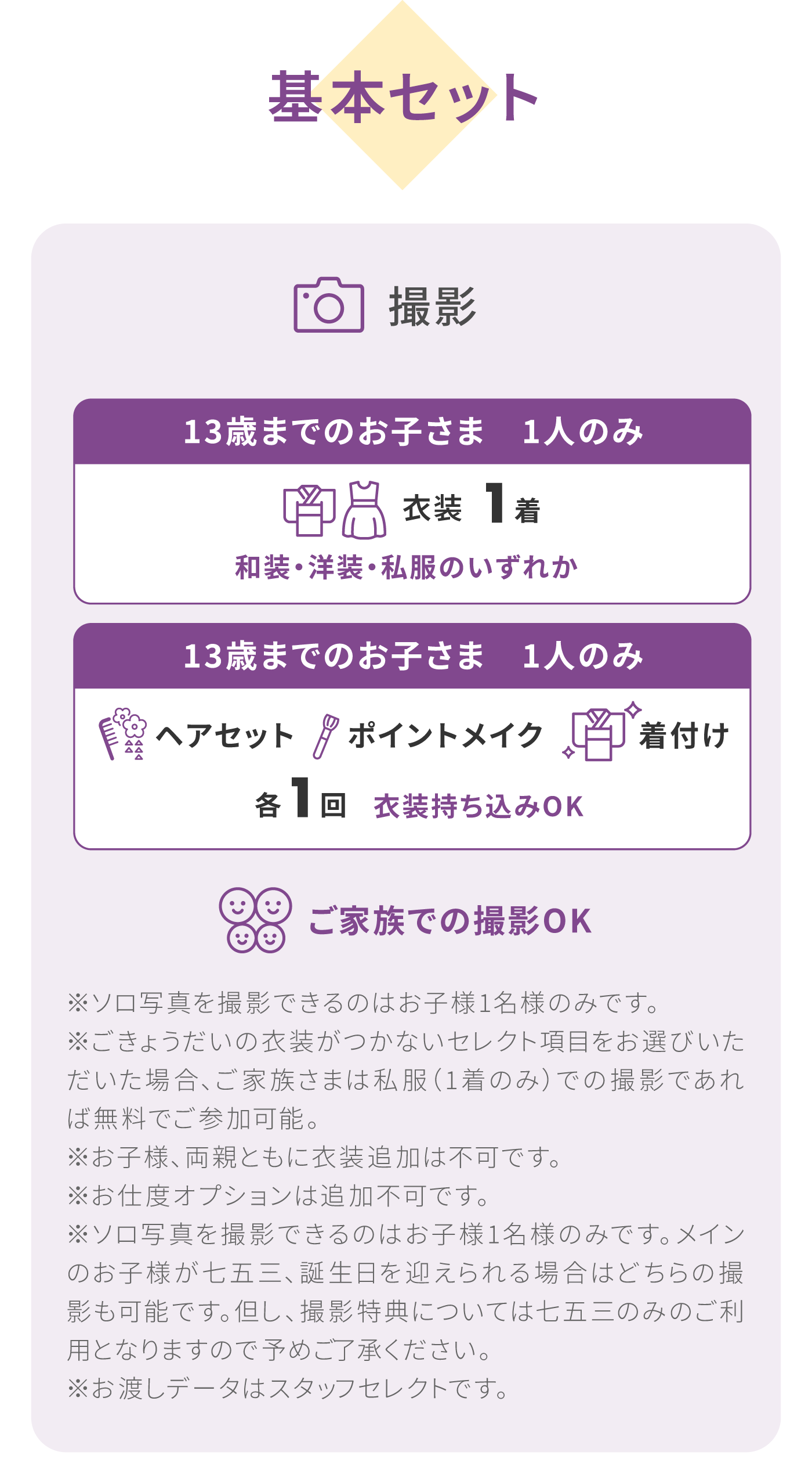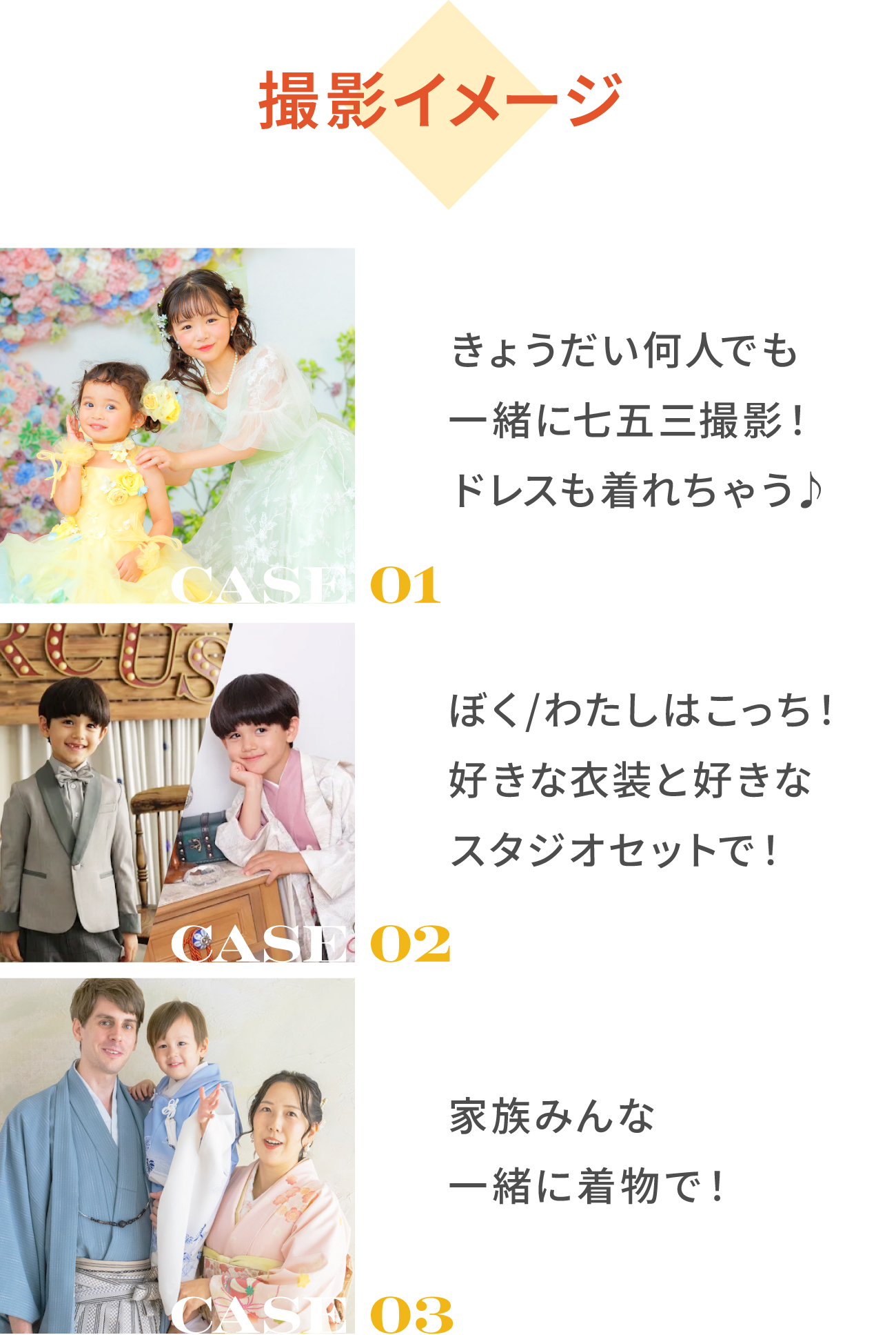 A変わりません。七五三のお子様が2名いらっしゃる場合は、2名様のソロ写真※1や、ご家族集合だけでなく「ママ+子ども」「パパ+子ども」「祖父母+子ども」などの撮影も可能です。
