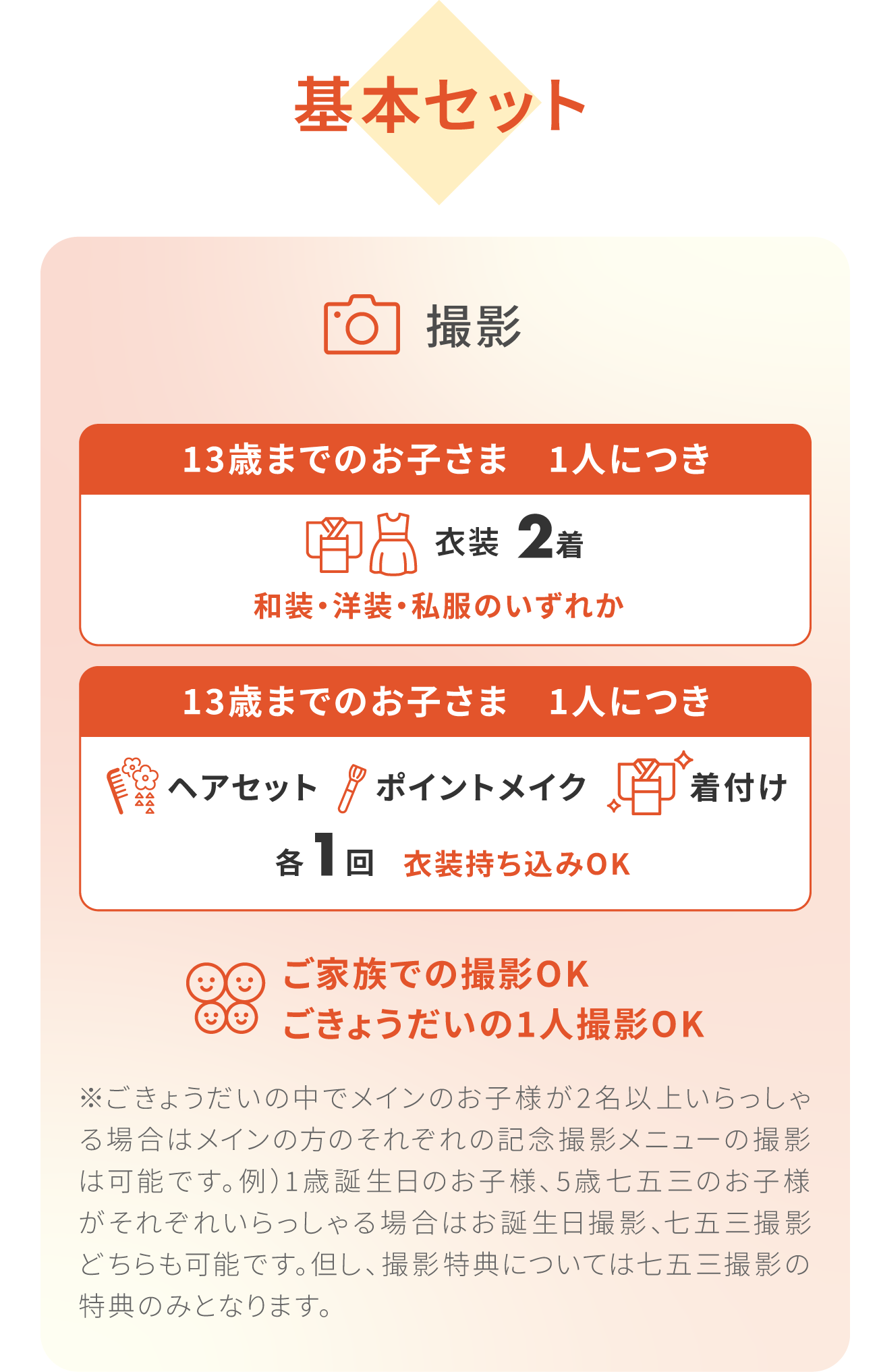 ※キャンペーンをご利用の場合、その他撮影メニュー特典やキャンペーンとの併用は不可です。ごきょうだい様で同時に記念撮影を行う場合はそれぞれの記念撮影をまとめて行うことは可能ですが、特典は七五三特典のみのご利用となります。
