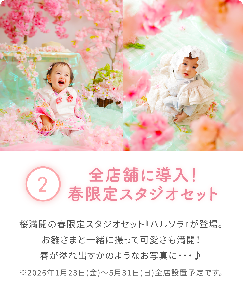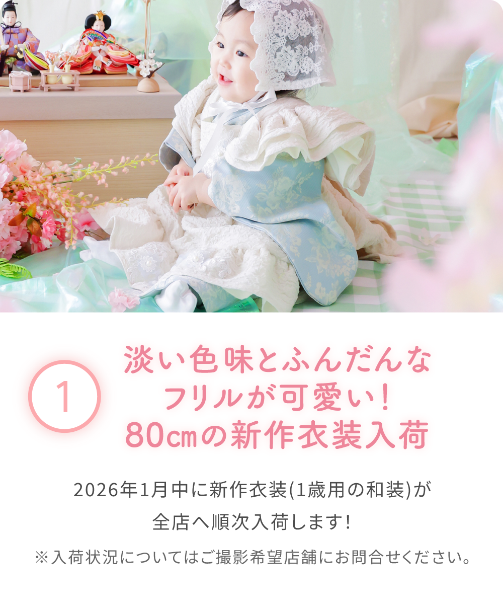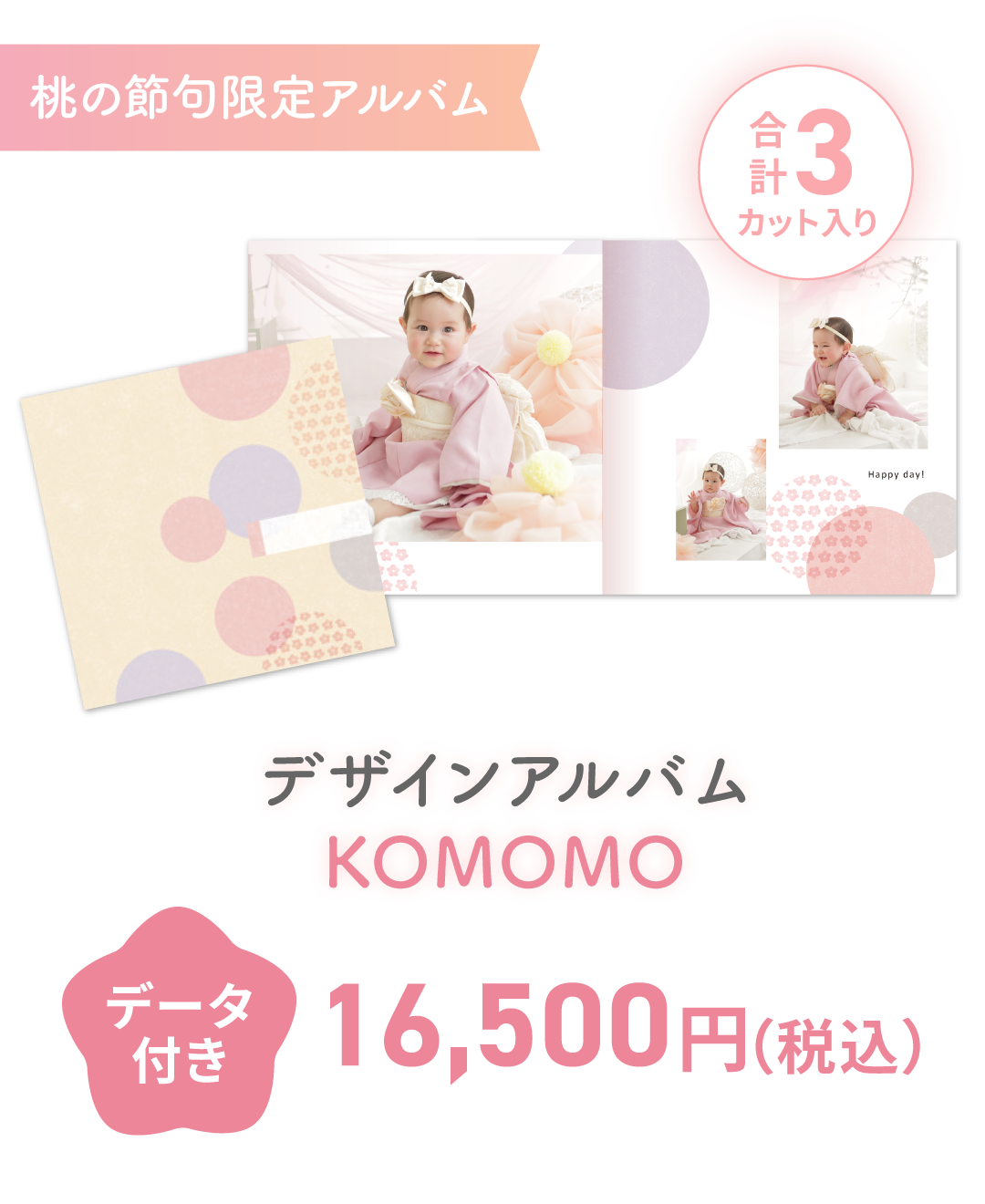 ※撮影メニューの混在は不可です。その他撮影メニューの併用をご希望の場合は基本プランでのご案内となります。 例)1歳の誕生日撮影+初節句撮影や、初節句撮影+ごきょうだいの七五三撮影、バースデー撮影等。