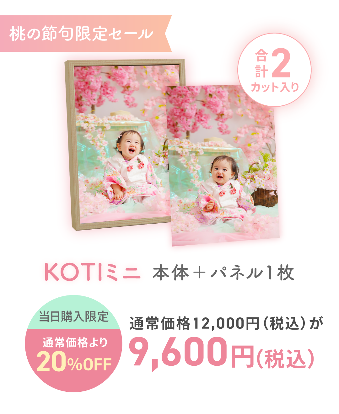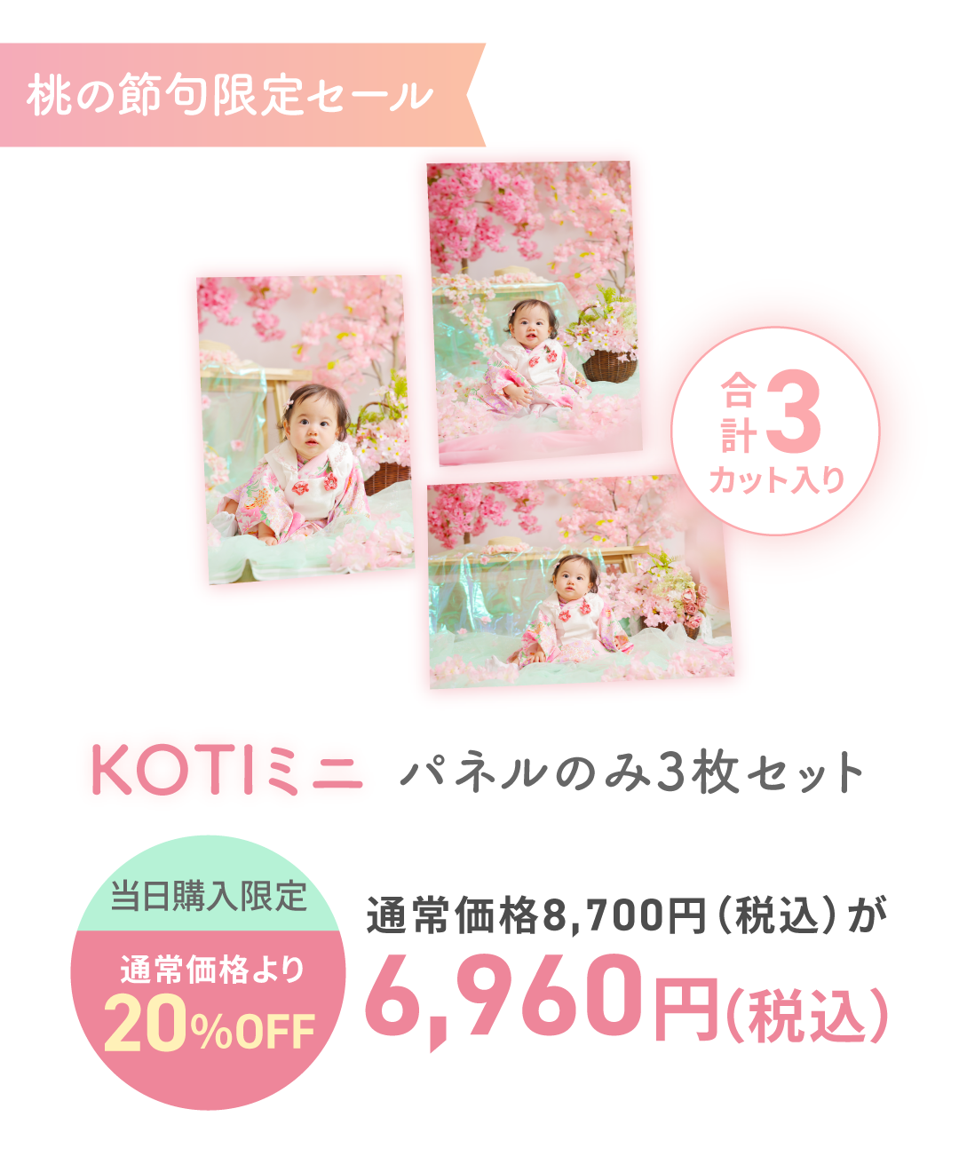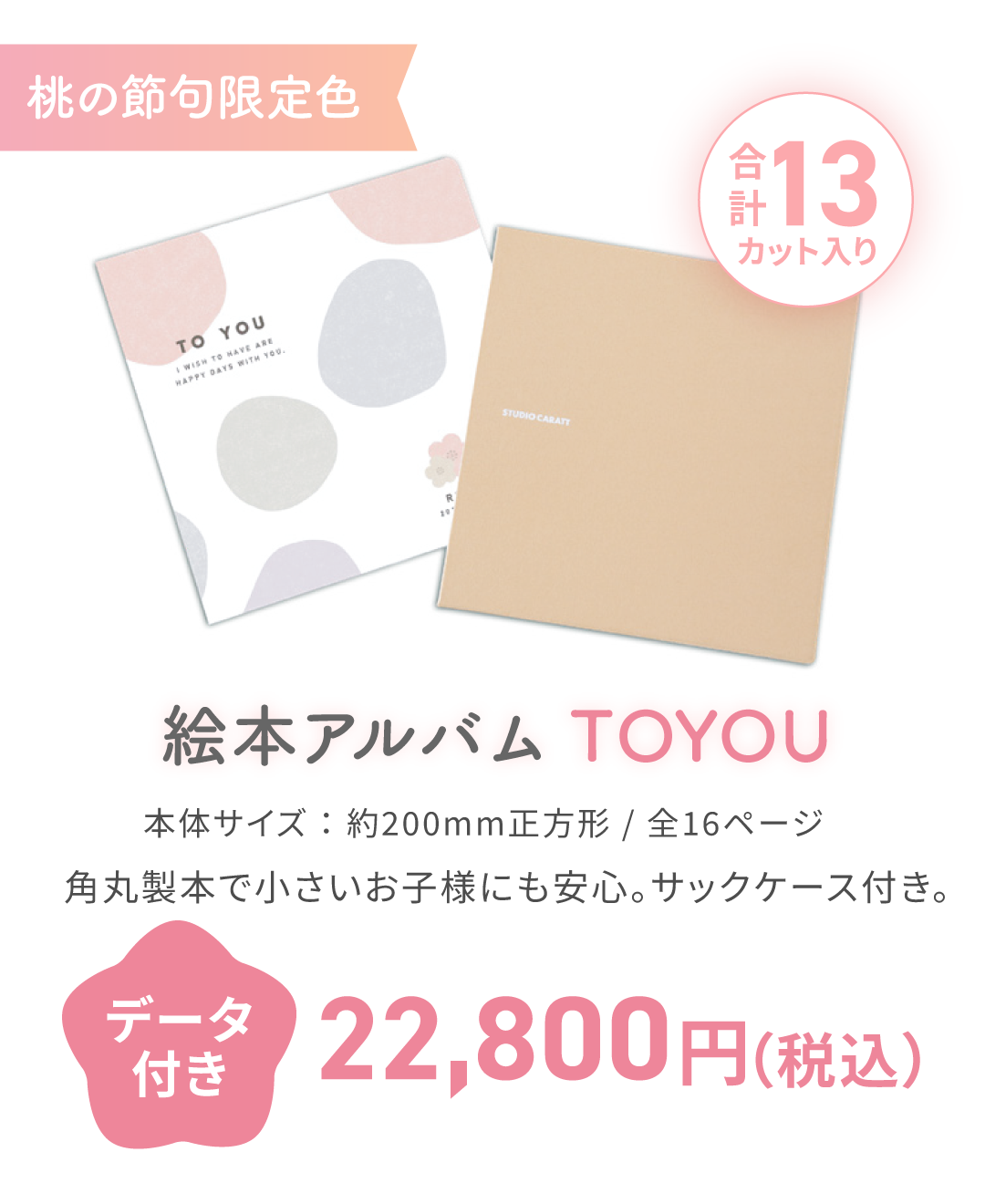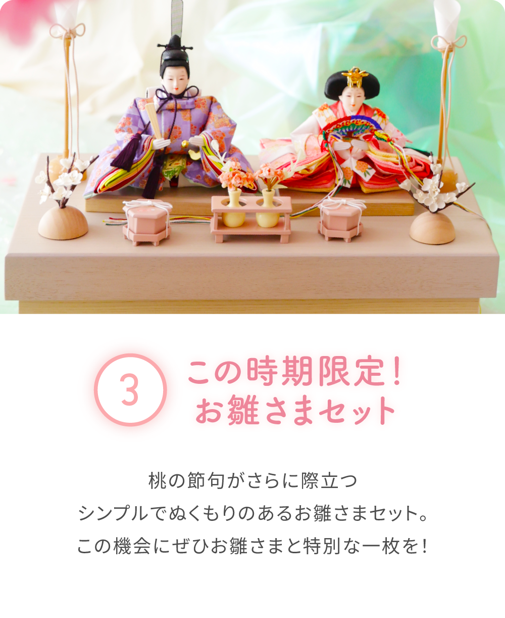 ※撮影メニューの混在は不可です。その他撮影メニューの併用をご希望の場合は基本プランでのご案内となります。 例)1歳の誕生日撮影+初節句撮影や、初節句撮影+ごきょうだいの七五三撮影、バースデー撮影等。