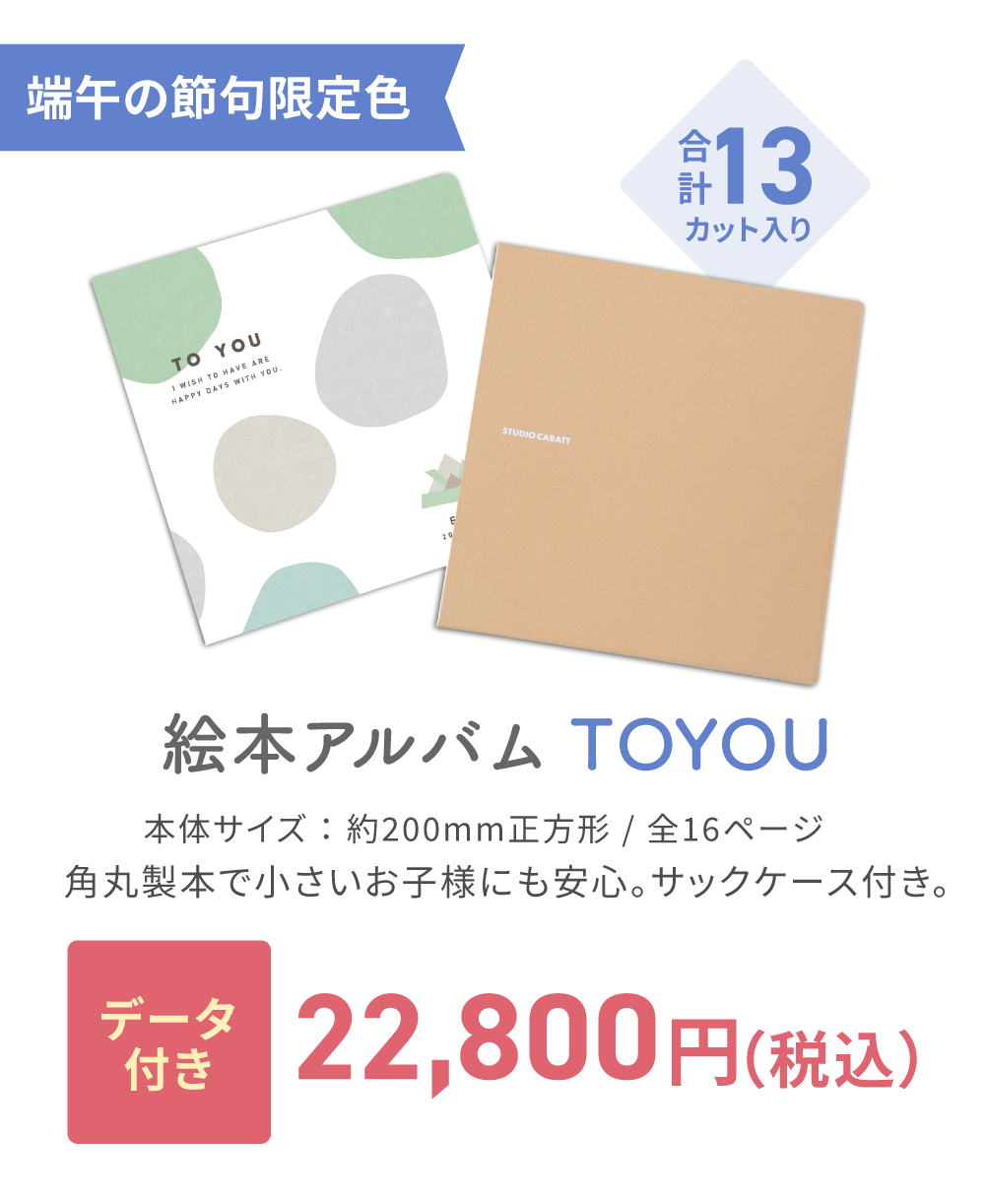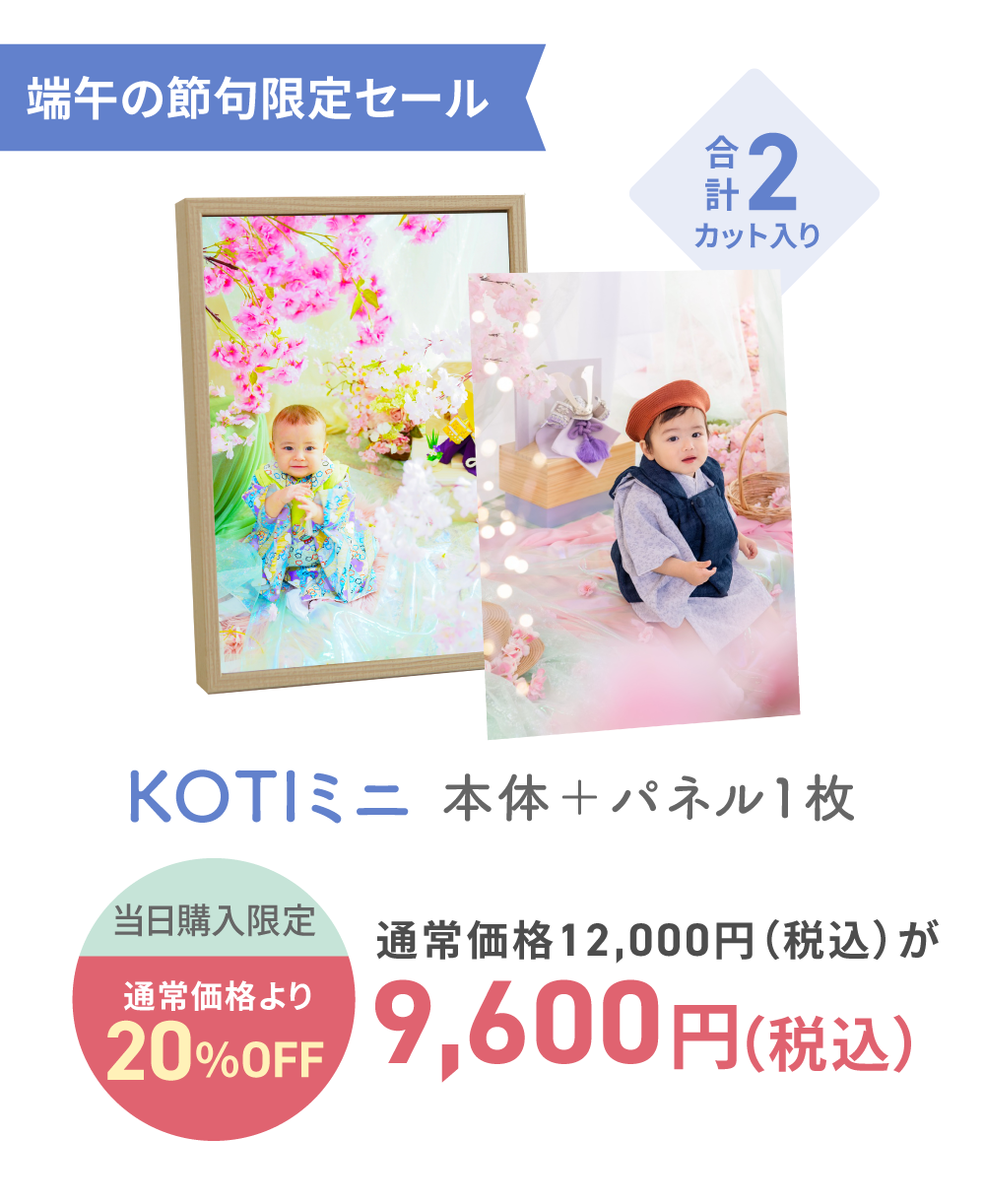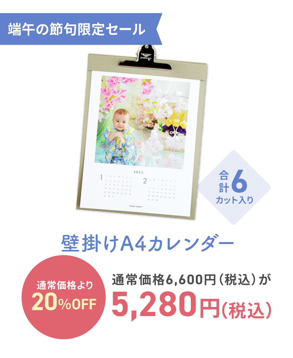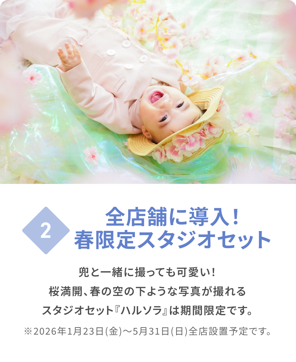 ※撮影メニューの混在は不可です。その他撮影メニューの併用をご希望の場合は基本プランでのご案内となります。 例)1歳の誕生日撮影+初節句撮影や、初節句撮影+ごきょうだいの七五三撮影、バースデー撮影等。