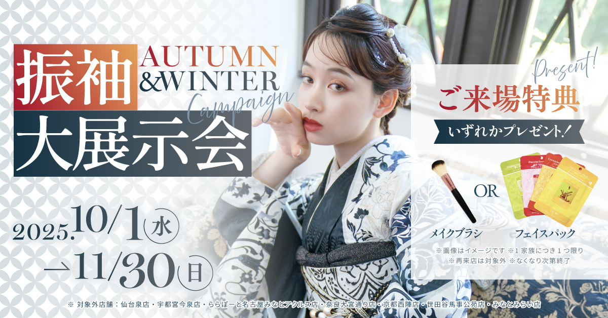 スタジオキャラットの一部の店舗で成人式用振袖展示会を開催。来場やご成約特典も大好評。